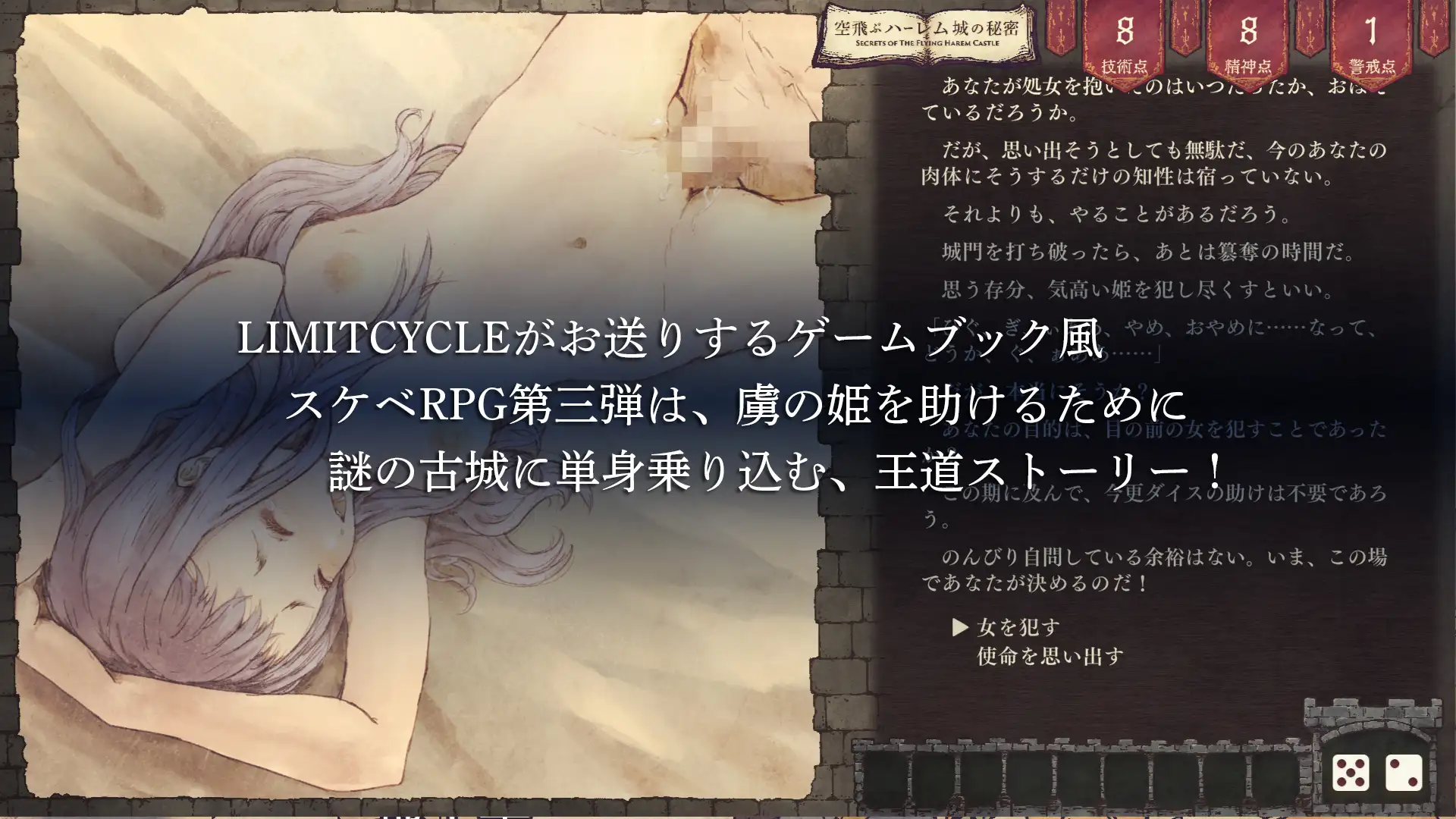 由LIMITCYCLE带来的游戏书风格香艳RPG第三弹,是一款为拯救被俘的公主而只身闯入谜之古城的王道故事。您将作为资深冒险者登上飞翔之城,运用自豪的智慧、勇气以及六种技能,驱散淫乱的城中女子和丑恶魔物的威胁,揭开城堡的秘密,救出美丽的公主。 剧情梗概你听说过关于飞翔之城的故事吗?据说来自世界各国的公主们聚集于此,每夜都在举行淫靡的宴会。 为了救出被掳走的公主而只身闯入飞翔之城的”你”,将亲眼目睹在那里展开的淫靡盛宴。是克服诱惑成功救出被俘的公主,还是沦为诱惑的俘虏?这一切都取决于你的判断和骰子的运气。 游戏介绍在本作这款游戏书风格的作品中,基本通过选项和骰子点数判定来推进剧情。有时也需要运用六种技能来打破困境。 技术点:作为通常判定基准的能力值精神点:使用技能时消耗的能力值,也会受到精神状态的影响警戒点:在城内采取引人注目的行动时会增加。超过一定值则会…… 判定系统采用2D6(两颗骰子的总点数),若点数低于规定值则视为成功。规定值会根据条件变化,请巧妙制定策略。 游戏仅支持自动存档,H场景回想从一开始便全部解锁。(含H原画29张)